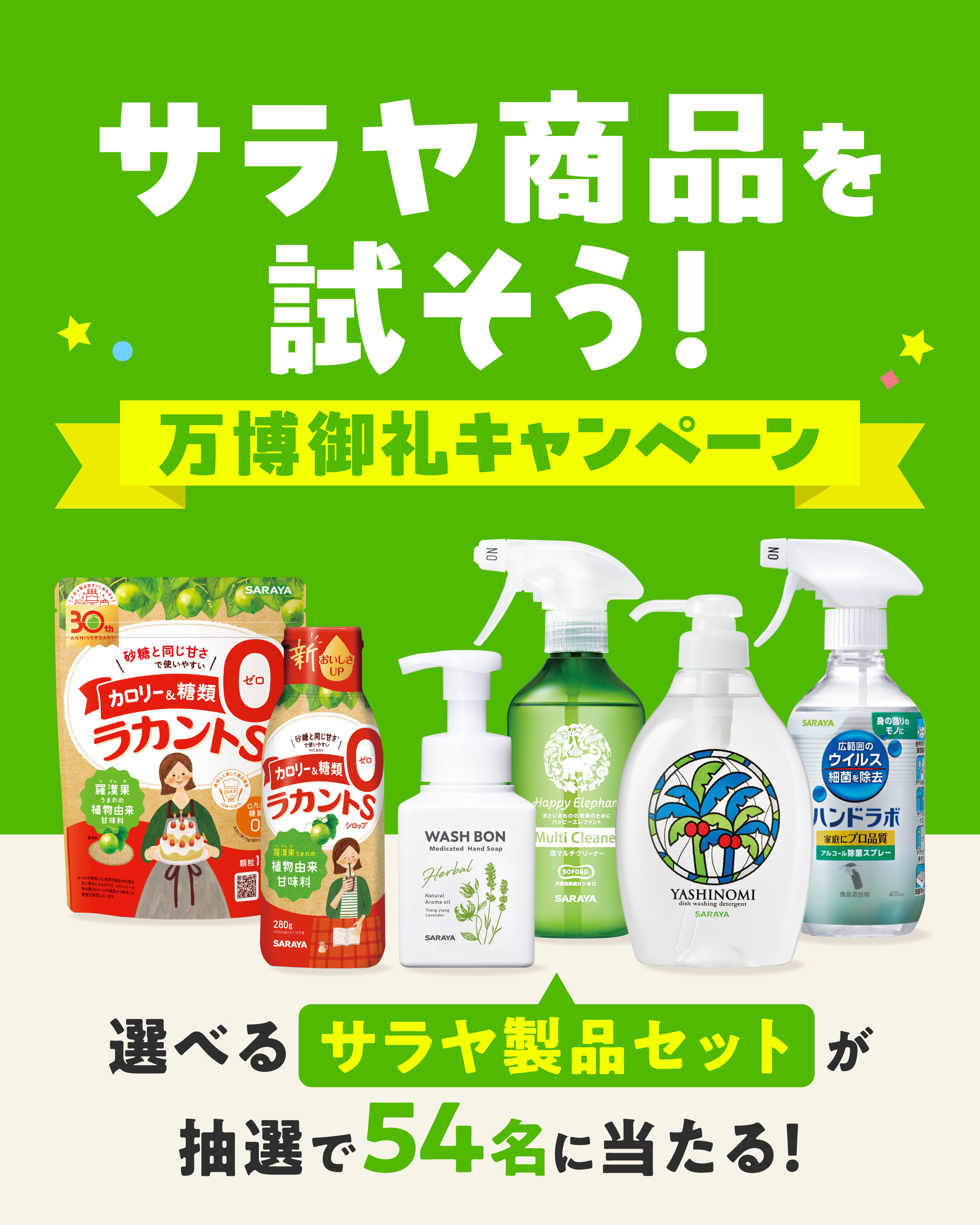 抽選で54名にサラヤ商品セットをプレゼント。2種のセットから1つ選んで応募。